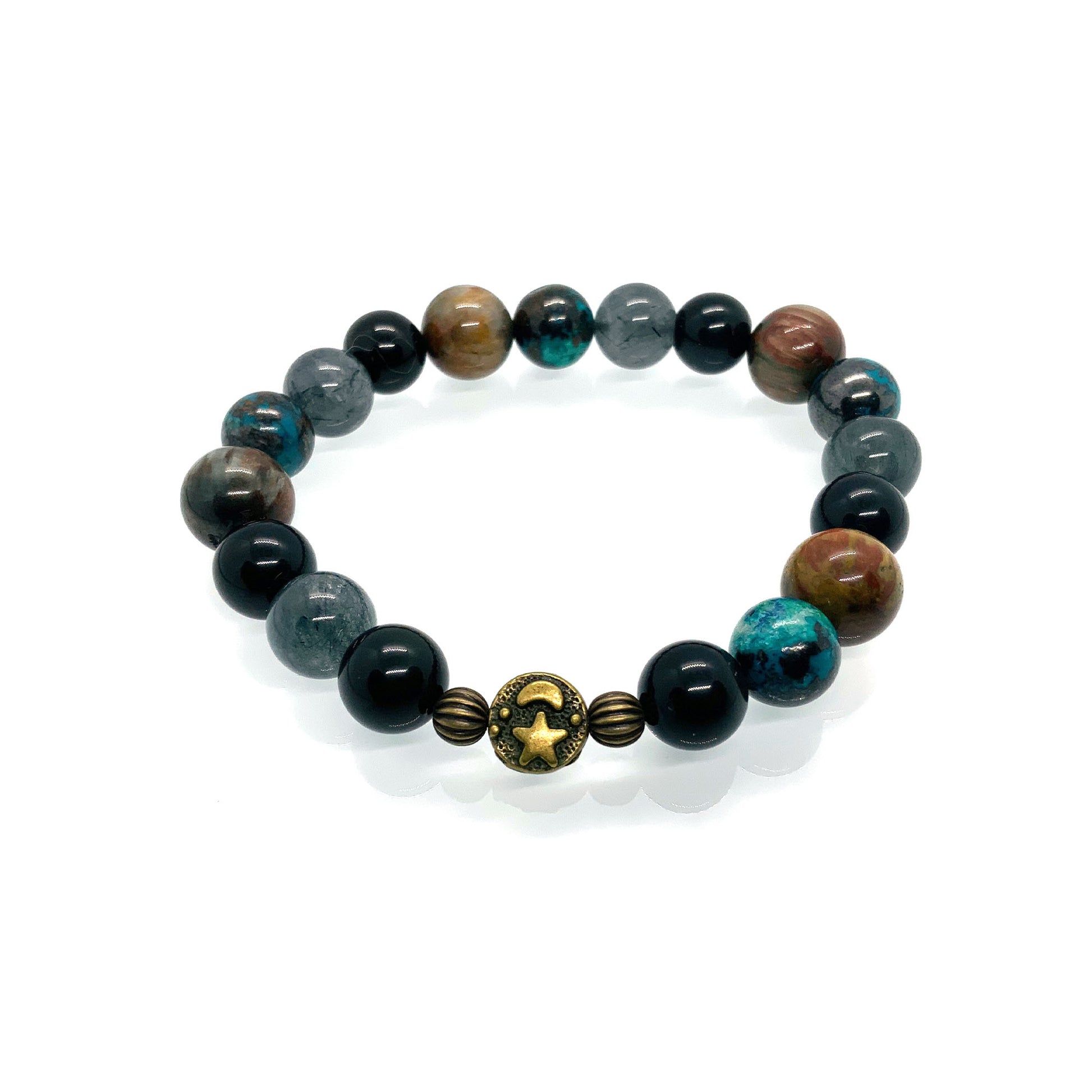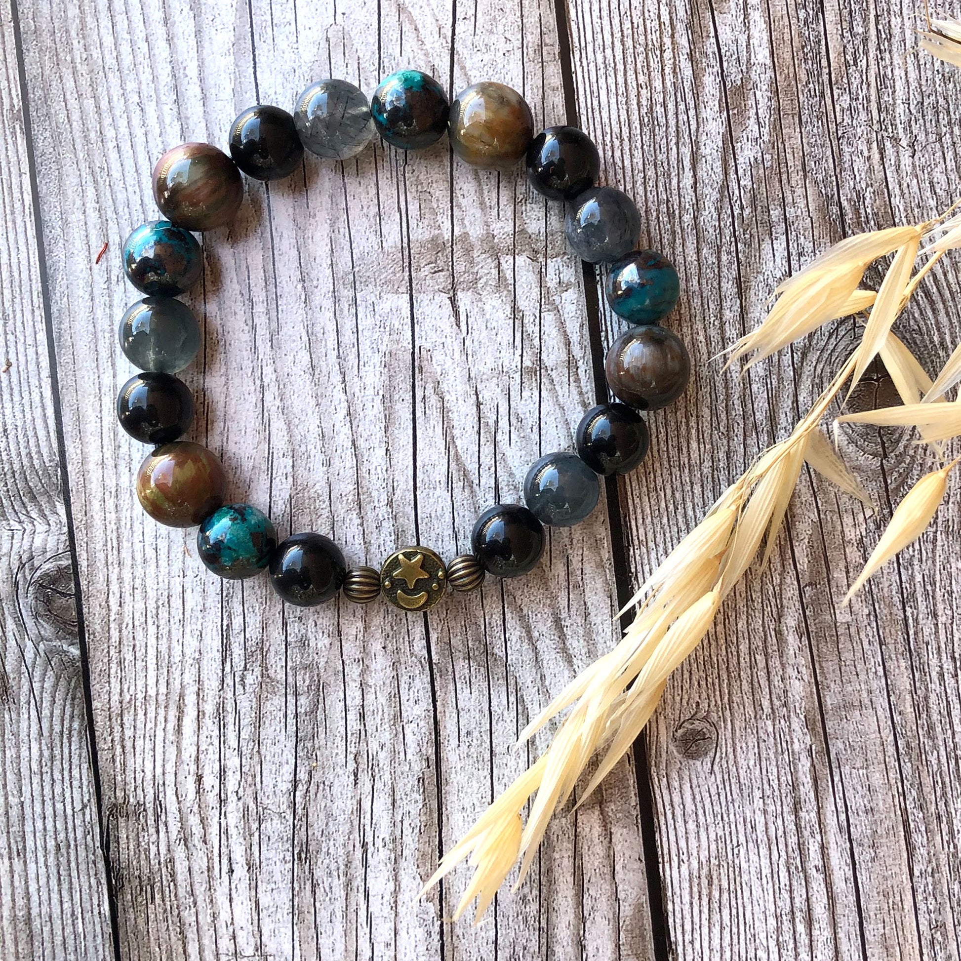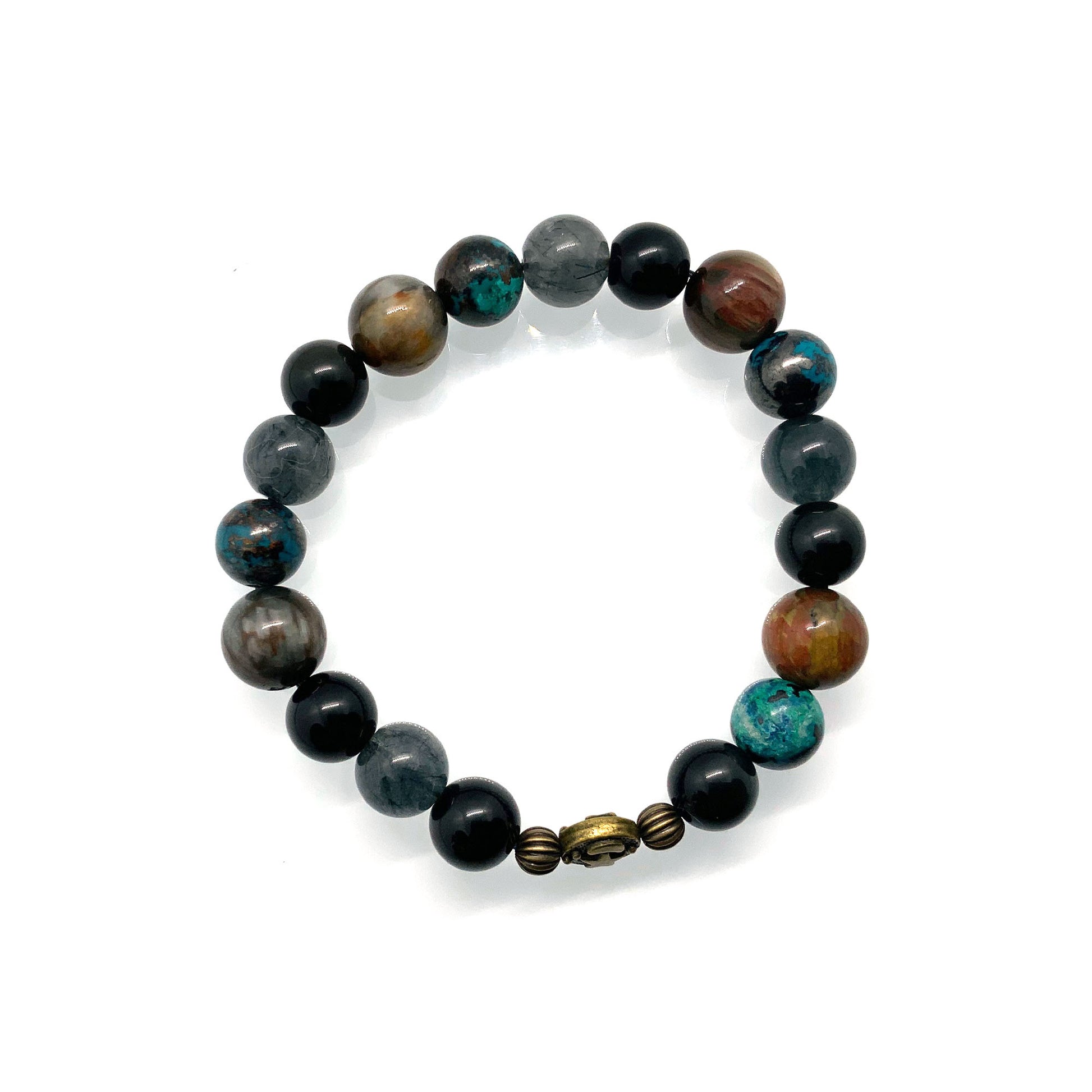 The combination of Rutilated Quartz, Obsidian and Turquoise